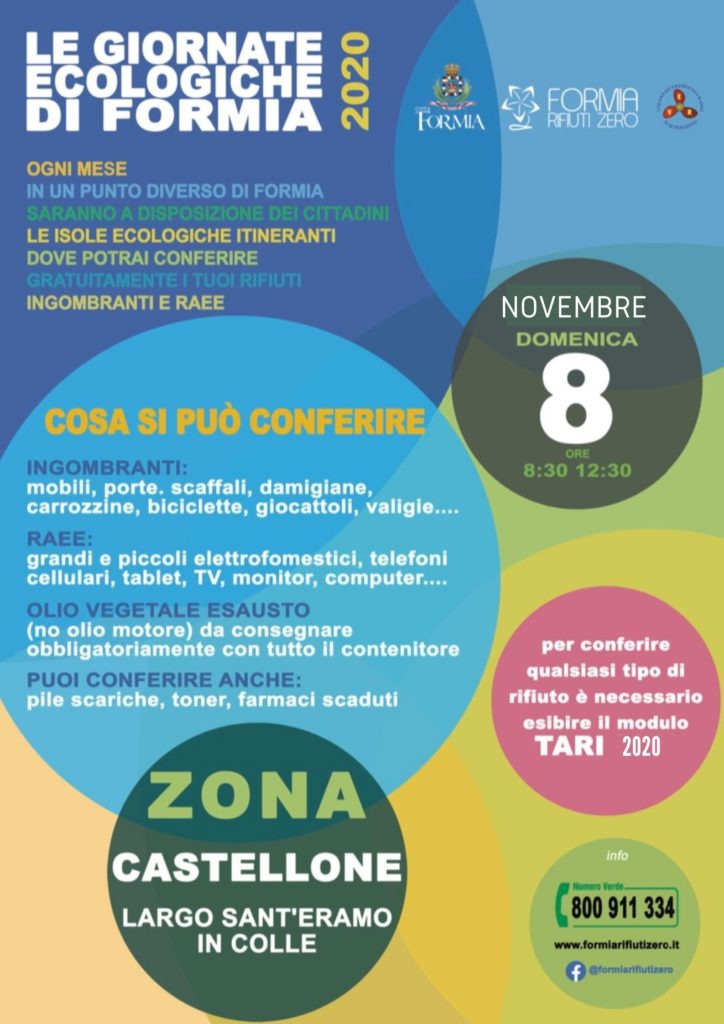 FORMIA – Domenica 8 novembre nuovo appuntamento con le “Giornate Ecologiche”. L’isola itinerante questa volta si sposta nel quartiere di Castellone presso Sant’Eramo in Colle, dove dalle 08:30 alle 12:30, gli operatori della Formia Rifiuti Zero, i volontari della Protezione civile Ver Sud Pontino e le associazioni “Fare Verde” e Comitato Civico “Mamurra” saranno a completa disposizione della cittadinanza per supportare nella consegna degli ingombranti e fornire informazioni sul corretto smaltimento della raccolta differenziata.