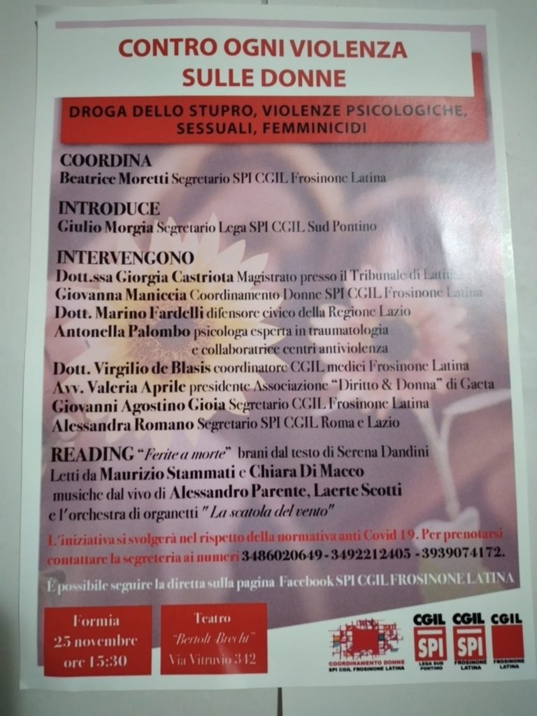FORMIA – In occasione della “Giornata internazionale contro la violenza sulle donne”, il prossimo 25 novembre, alle 15.30 a Formia, presso il teatro “Iqbal Masih”, si terrà l’incontro “Contro ogni violenza sulle donne – Droga dello stupro, violenze psicologiche, sessuali, femminicidi”, promosso e organizzato da Coordinamento Donne Cgil Spi Latina- Frosinone; Spi Cigil Sud Pontino; Spi Cgil Frosinone-Latina, Cgil.