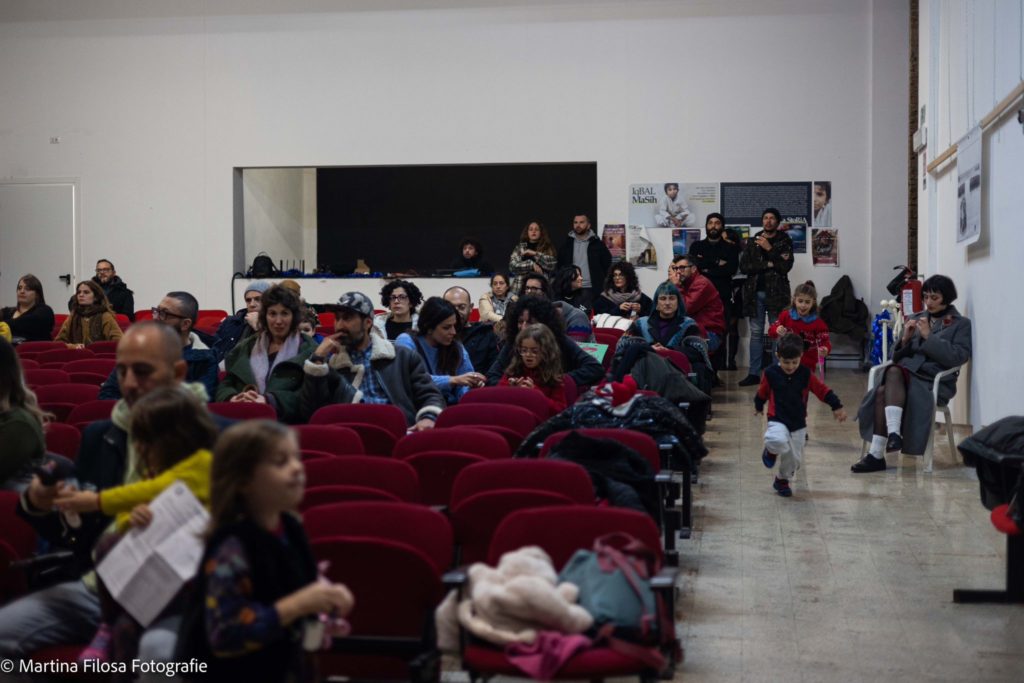 Alle ore 18:00 la sola si è riempita. Lo speaker radiofonico, Ulisse Marciano, ha dato il benvenuto a tutti i presenti ringraziando le organizzatrici, Paola Rotasso ed Ilaria Tortoriello, i loro partner (Maurizio Stammati presidente dell’Associazione collettivo teatrale Bertolt Brecht di Formia, Marco Petrone – fonico del teatro, il grafico Andrea Masone, Armando Caramanica Editore e RAV – Radio Antenna Verde), il gruppo di “Stop genocide Formia” composto da Claudia Isernia, Francesca Acampora ed Antonio De Paola (che stanno facendo divulgazione e raccolta di donazioni libere per il PCRF – Fondo di Soccorso per i bambini palestinesi) e tutti gli artisti donatori di una o più opere: Antonio De Matteo (attore), Rocco Lombardi (illustratore), Ilaria Tortoriello (fotografia), Simona Rotasso (pittura), Mauro Treglia (chef), Angelo Rasile (illustratore), Filippo Riniolo (artista), Federica Centore (stilista), Simone Lucciola (illustratore), Rosaria Cefalo (illustratrice), Martina Filosa (fotografa), Enrica De Nicola (fotografa), Luigi Grieco (fotografo), Giovanni Giunta (pittore), Lucia Simeone (fotografa), Antonio Palma (illustratore), Alessandra Fedele (ceramista), Industria Indipendente (Martina Ruggeri ed Erika Galli – Roma), Cecilia Nuzzo (fotografa), Bar Cardillo (pasticcere), Giuseppe Pappa (corniciaio), Gianpaolo Caliman (autore), Michela De Spagnolis (illustratrice).