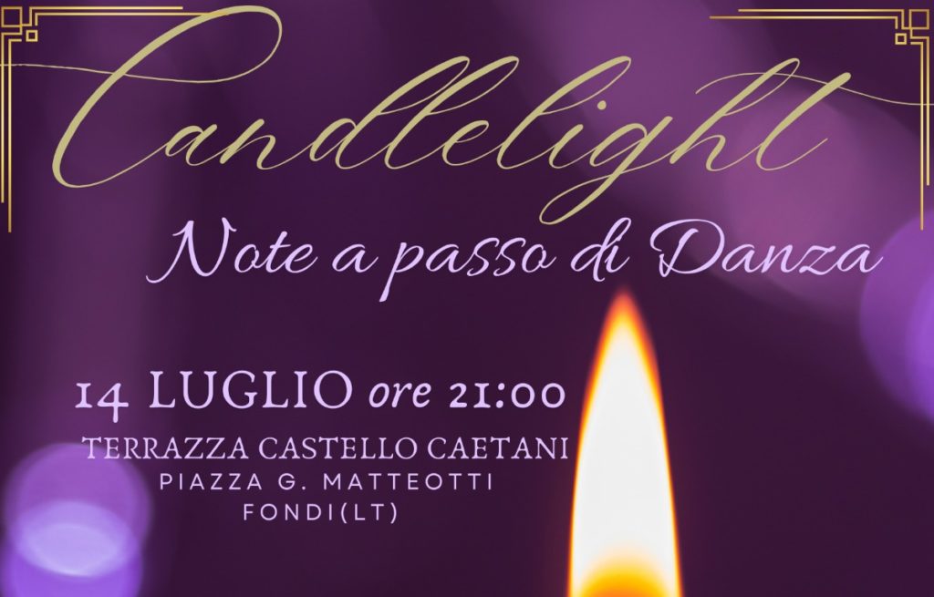 FONDI – Domenica 14 luglio, a partire dalle 21, nello splendido scenario della terrazza del Castello Caetani a Fondi, si svolgerà l’evento ”Candlelight – Note a passo di Danza”. Organizzato dall’associazione culturale “Musicinecultura“, l’evento, alla sua prima edizione, coinvolgerà le arti della musica e della danza in un’armonica fusione che emozionerà il pubblico presente. L’appuntamento si aprirà con il benvenuto da parte di Fabiola Lauretti, presidente dell’Associazione culturale Musicinecultura che esporrà il lavoro dell’associazione. Dopo i saluti istituzionali ed una brevissima presentazione degli artisti, si inizierà con l’esecuzione delle melodie da parte del pianista Antonio Di Costanzo dell’Associazione Largo alla Musica.