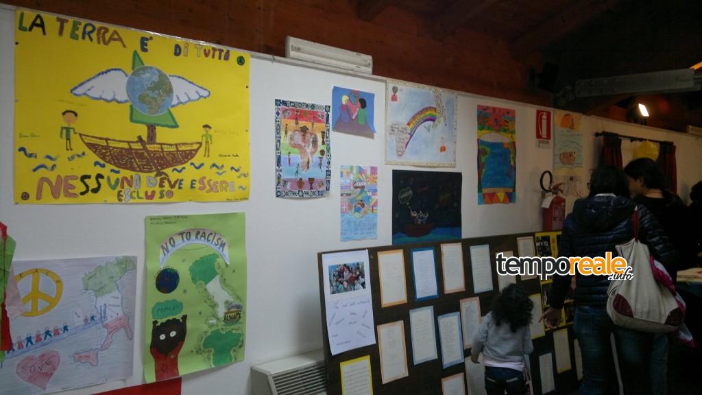 La Sala Ribaud del Comune è piena di ragazzi. In fondo sono esposti i loro lavori. “La terra è di tutti – è scritto su uno dei cartelloni -, nessuno deve essere escluso”. Al centro è disegnata una barca che ha ali al posto delle vele, sostenute da un cerchio a forma di pianeta. Don Alfredo, parroco della Chiesa di Sant’Erasmo, suona la chitarra, accompagnato dal bongo percosso da un ragazzo africano. La pelle scura risalta sulla maglia gialla del Gruppo Umana Solidarietà, l’ong che dal maggio 2014 dà ospitalità a decine di stranieri richiedenti asilo nell’ambito del progetto realizzato in convenzione con la Prefettura e in collaborazione con il Comune. C’è il responsabile del GUS Alessandro Dessì. C’è Maria Grossi, referente per “Insieme – Immigrati in Italia”. C’è il dirigente dell’IC “Dante Alighieri”, il professor Vito Costanzo. E c’è l’Amministrazione comunale, rappresentata dall’Assessore ai Servizi Sociali Giovanni D’Angiò.