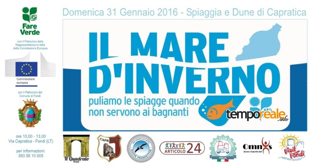 L’appuntamento, che gode del prestigioso Patrocinio della Rappresentanza in Italia della Commissione Europea e dell’Amministrazione Comunale, è fissato per Domenica 31 Gennaio 2016, a Fondi, dalle ore 10 alle ore 13, nell’ambito dell’Iniziativa nazionale di “Fare Verde Onlus” Associazione Ambientalista dal nome “Mare d’Inverno 2016”. Nel mirino la duna e la spiaggia di Capratica (Sito di Interesse Comunitario Parco delle Dune di Capratica per l’esattezza). Il ritrovo è previsto per le ore 10 in Via Capratica.