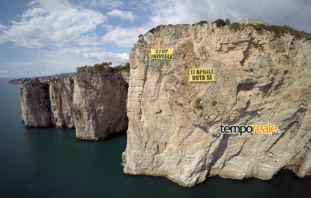I climber di Greenpeace hanno aperto due enormi striscioni, per un totale di circa 250 metri quadrati, dove si poteva leggere: “Stop trivelle, il 17 aprile vota sì”. Intanto, un altro team stendeva sulle acque antistanti la scogliera un secondo striscione che ribadiva anche dal mare il messaggio “Stop trivelle”.