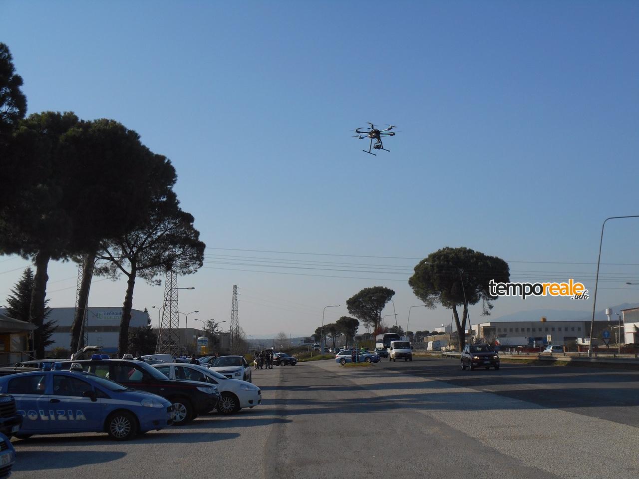 FROSINONE – E’ partita da Frosinone la sperimentazione per l’utilizzo dei droni nei servizi di controllo del territorio e di ordine pubblico. Venerdì scorso, personale della Questura, della Polizia Stradale di Frosinone e del Reparto Prevenzione Crimine Lazio, coordinato dagli specialisti del Servizio Controllo del Territorio della Polizia di Stato, unitamente a Carabinieri e Guardia di Finanza, hanno effettuato un posto di controllo sulla strada ASI nel corso del quale è stato impiegato il Drone, certificato dall’ENAC, per la ripresa dall’alto di tutte le fasi dell’attività operativa.